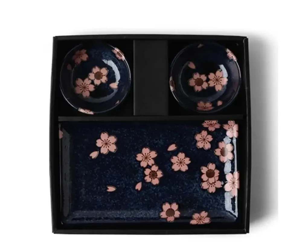 The Combination Of Pink And Navy Is A New Classic!This Beautiful Pink Sakura Design Against The Dusky Blue Bowl Is Perfect For Any Decor.The Sushi For Two Set Comes With Two Rectangular Plates, Two Sauce Dishes And Two Pairs Of Chopsticks In A Black Gift Box.