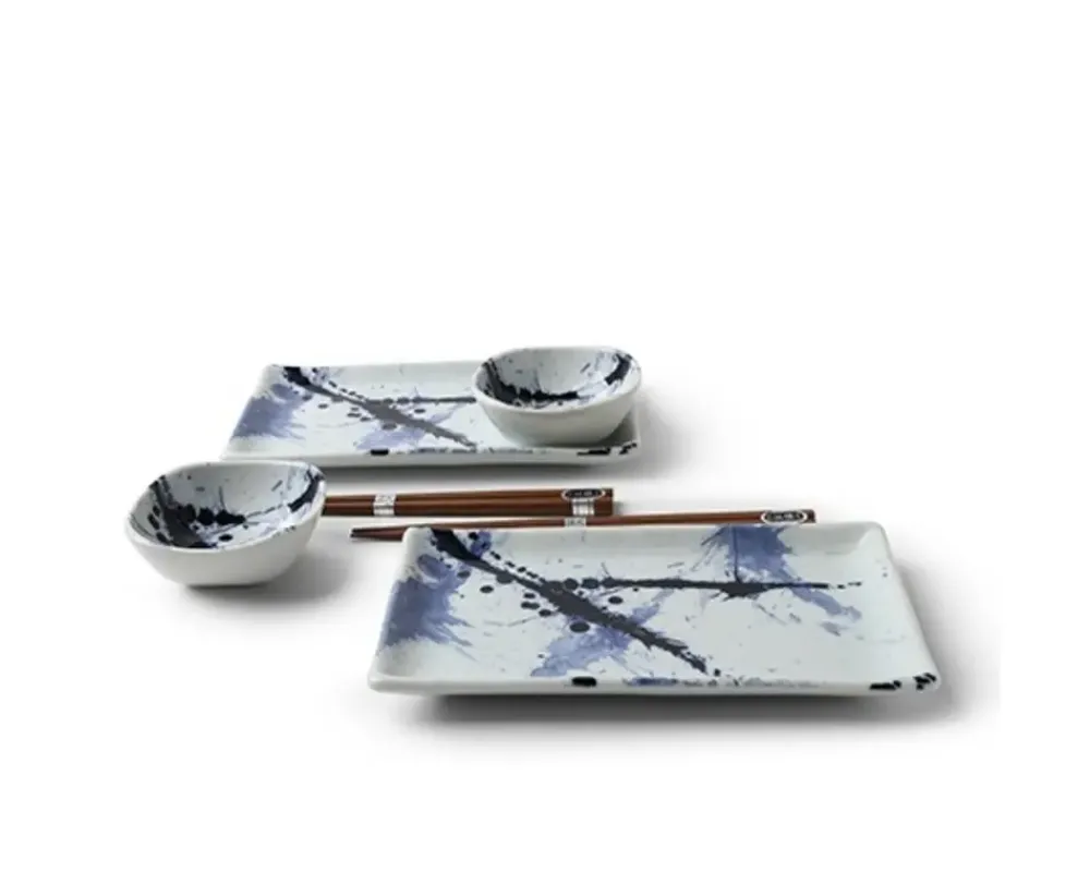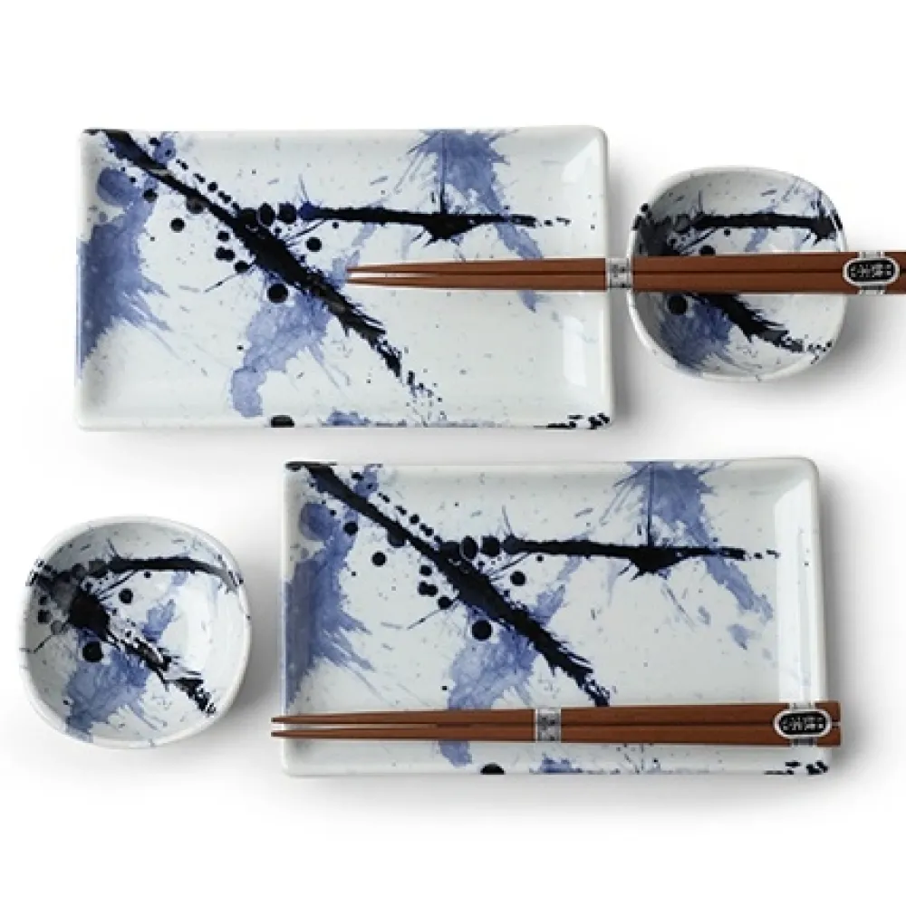 Blue Glazes Artistically Splattered On This Blue Sumi Collection Creates A Beautiful Pattern That You Will Love Even On The Bluest Days.Blue Sumi Sushi Set Includes Two 8.75″ X 5″ Rectangular Plates, Twosauce Dishes And Two Pairs Of Chopsticks So You Can Share Some Sushi With Your Honey.Also Makes A Nice Candle/Soap Dish Set.Packaged In A Gift Box Making It Perfect As A Housewarming, Hostess Or Wedding Gift. The Sushi Sets In Different Designs/Colors Are Also Available. See More.