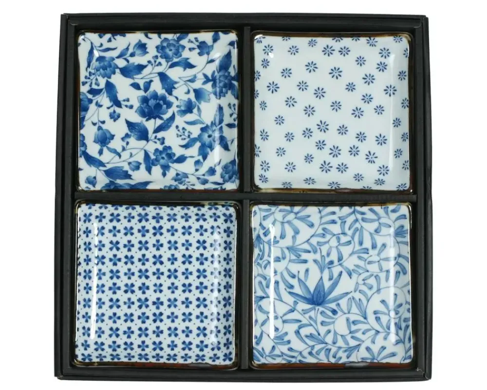 Wonderful Assorted Floral Patterns In The Traditional Blue And White Color Scheme.This Set Of Four 5″ Square Tabletop Plates Makes A Beautiful Gift For Your Favorite Flora Lover!Packaged In A Gift Box.Matching Sauce Dish Set Also Available [Item# J1006].