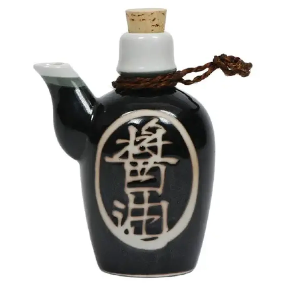 Cork Top Sauce Pot For Soy Sauce.Glossy Black Glaze With “Shoyu” (Soy Sauce) In Kanji (Chinese Character Used In Japanese Written Language).